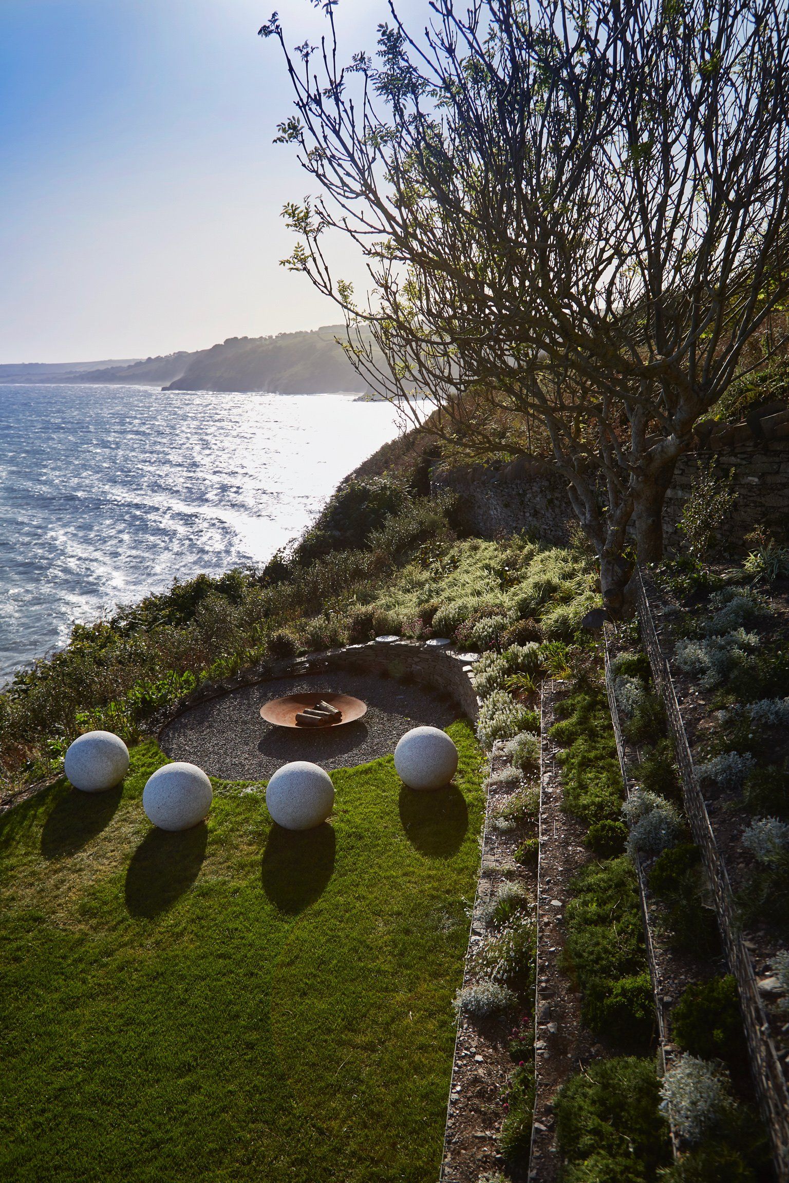 Outside, there is a furnished*, cantilevered teak deck with stunning views both towards Start Point and Dartmouth harbour. The fire pit is at the end of the garden towards Start Point, with stone seating surrounding it. At the other end of the house, towards Dartmouth, is the swimming pool* with furnished* terrace, and the raised hot tub. Beyond this, through the planted bank, is a secluded seating area with two Adirondack chairs. Parking for 4 cars.